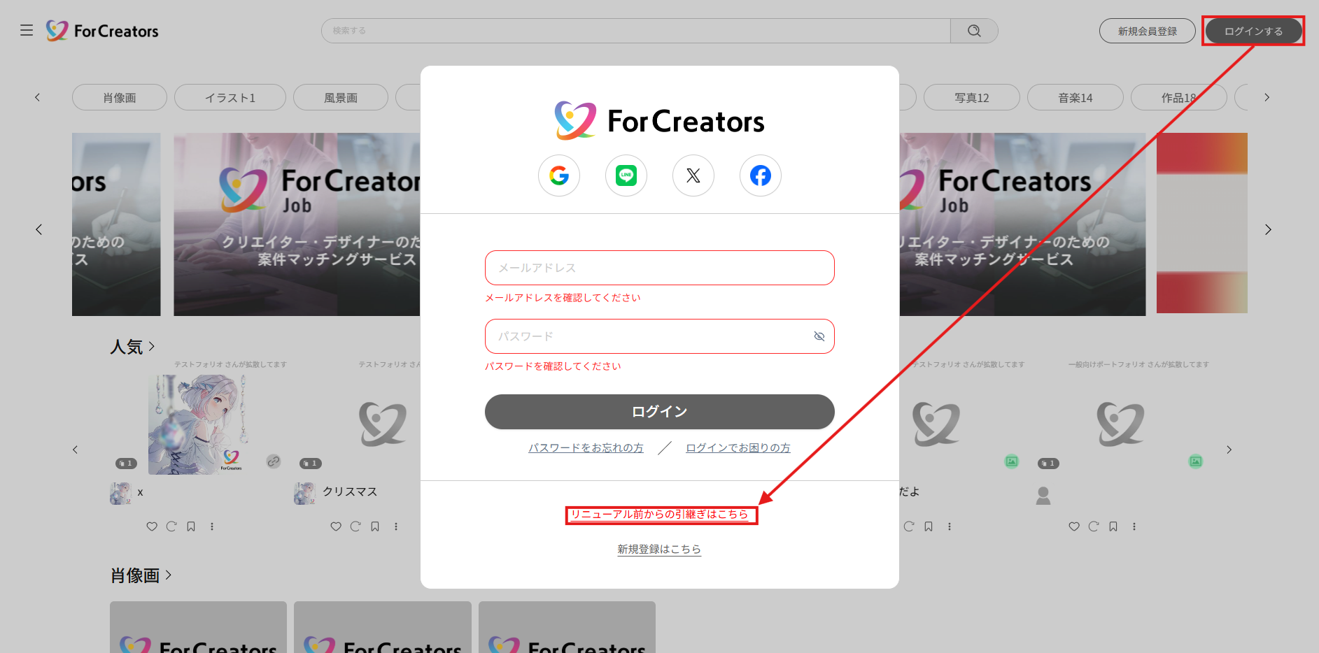 - 「ログインする」から「リニューアル前からの引継ぎはこちら」をクリック
